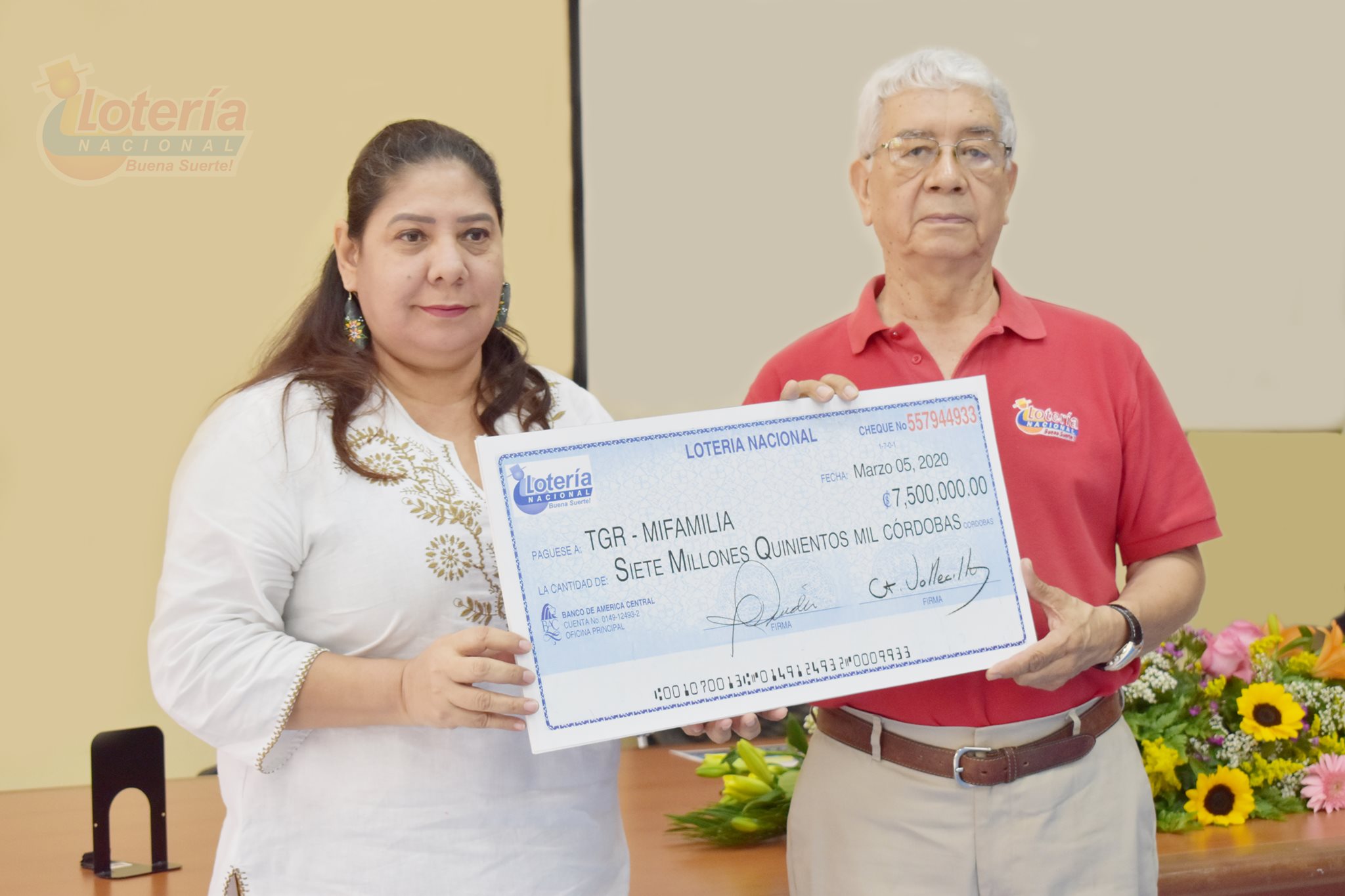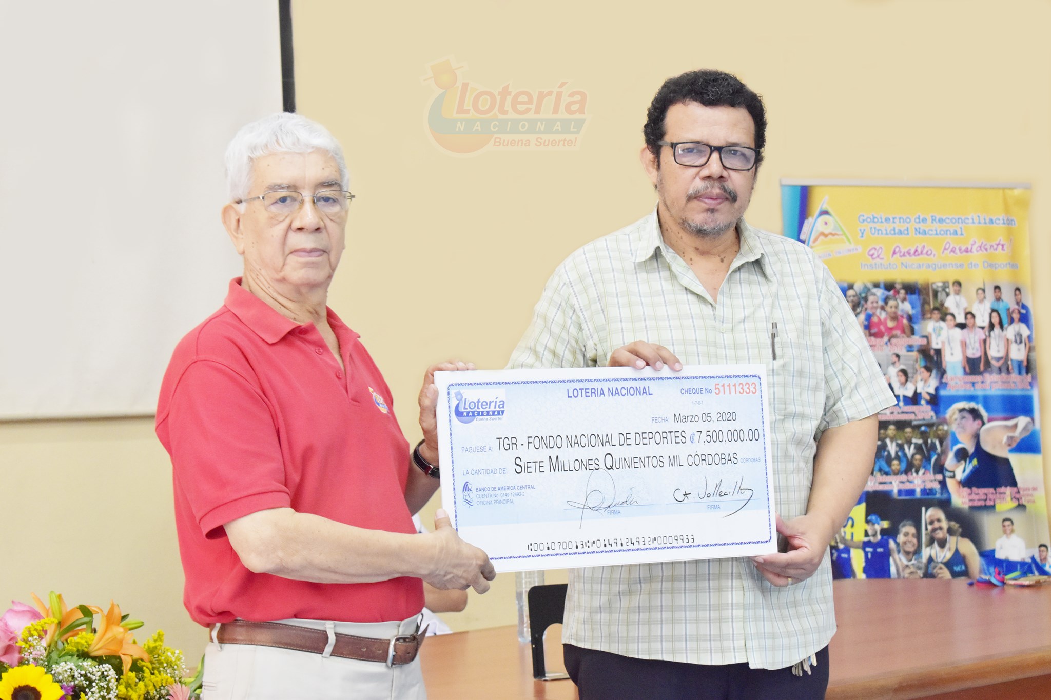 Ernesto Vallecillo, gerente general de Lotería Nacional entregó un cheque con 7 millones 500 mil córdobas a Marlon Torres, director ejecutivo del IND, y otro por 7 millones 500 mil córdobas a Carold Herrera, directora del Programa Amor del Ministerio de Familia, Adolescencia y Niñez (MIFAN), para un total de 15 millones de córdobas entregado al mes de marzo.